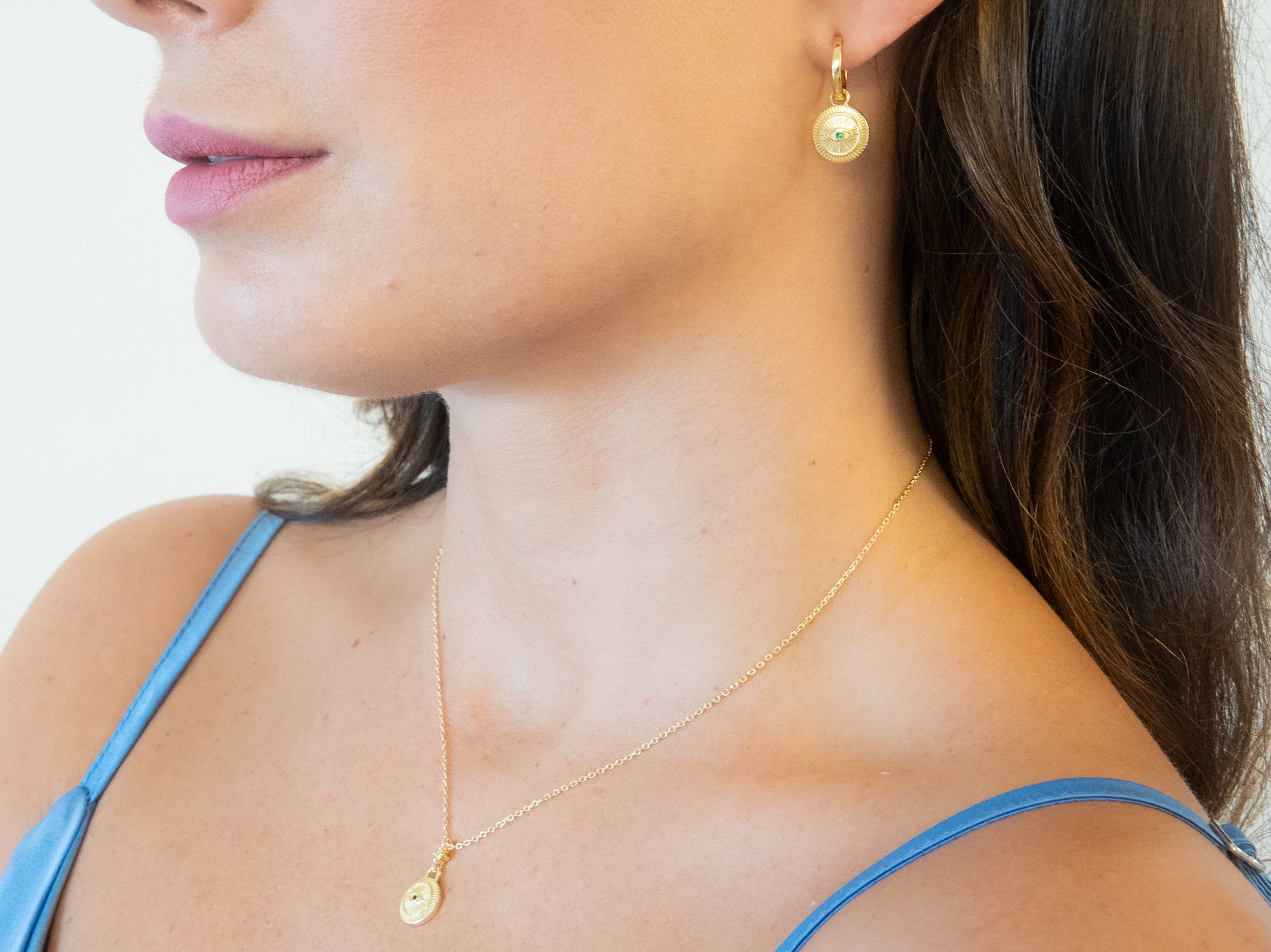 The pendant features an evil eye charm.