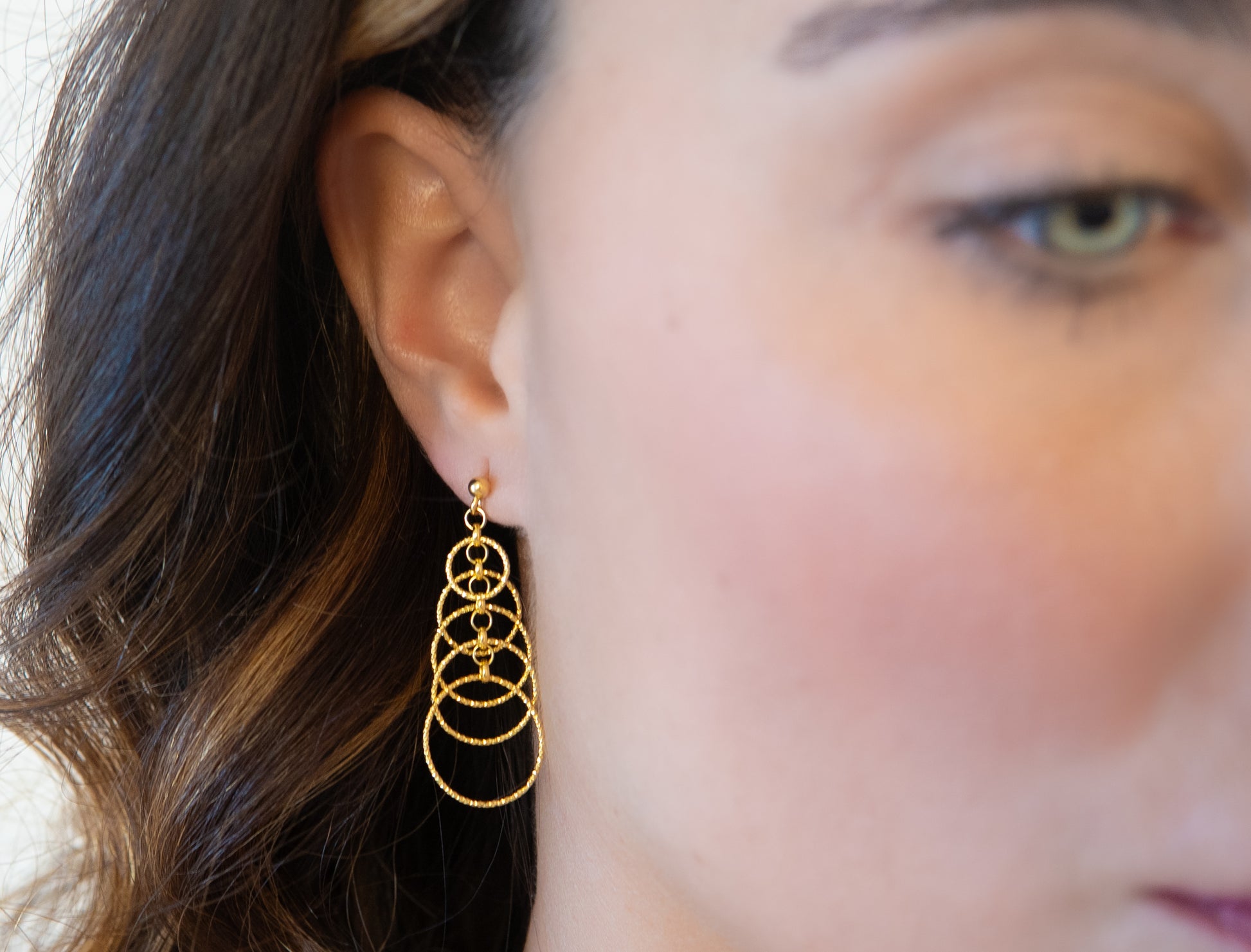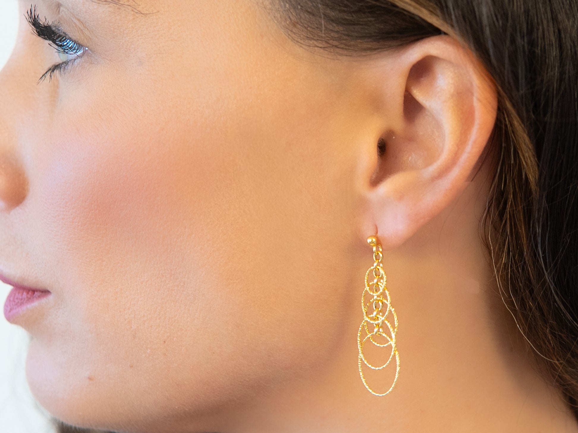 These long dangle earrings are made of 5 superimposed rings forming a pyramid.