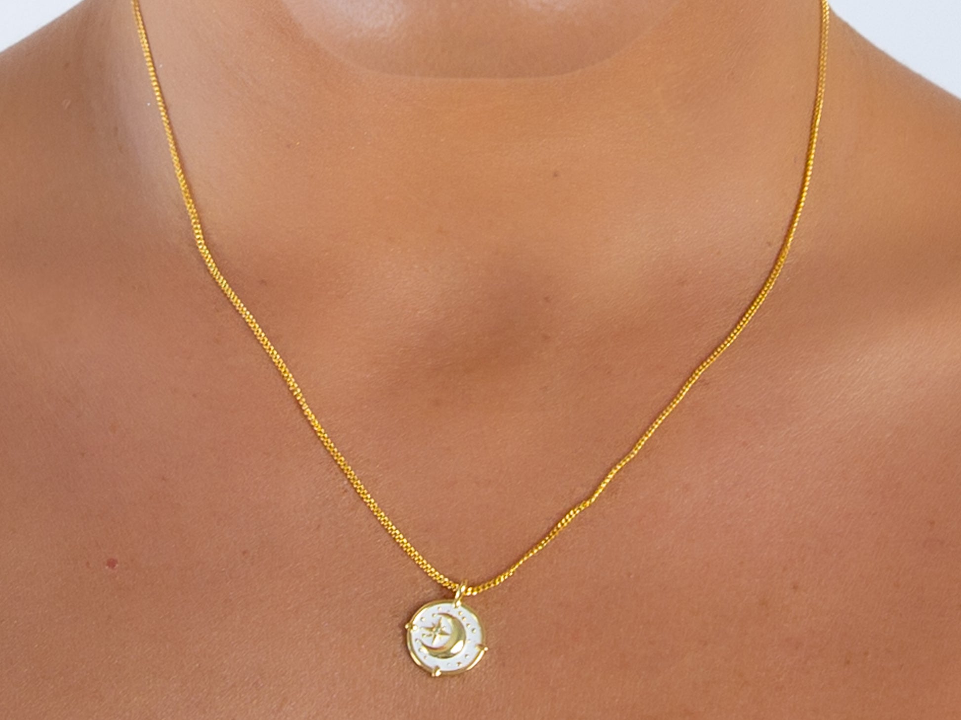 This necklace features a moon and wind rose charm.