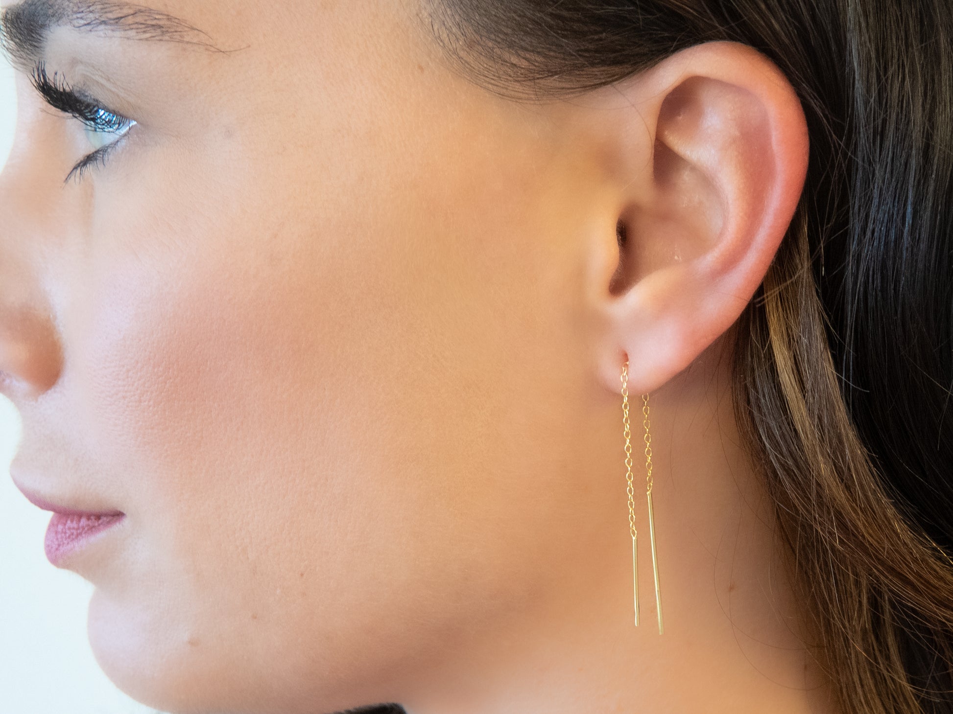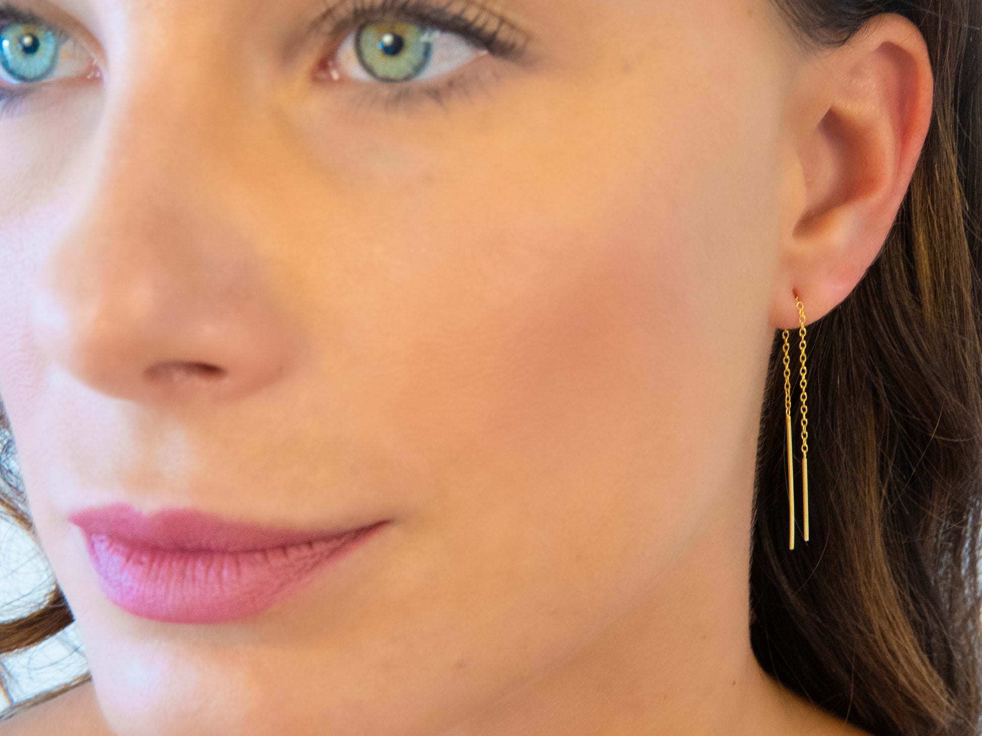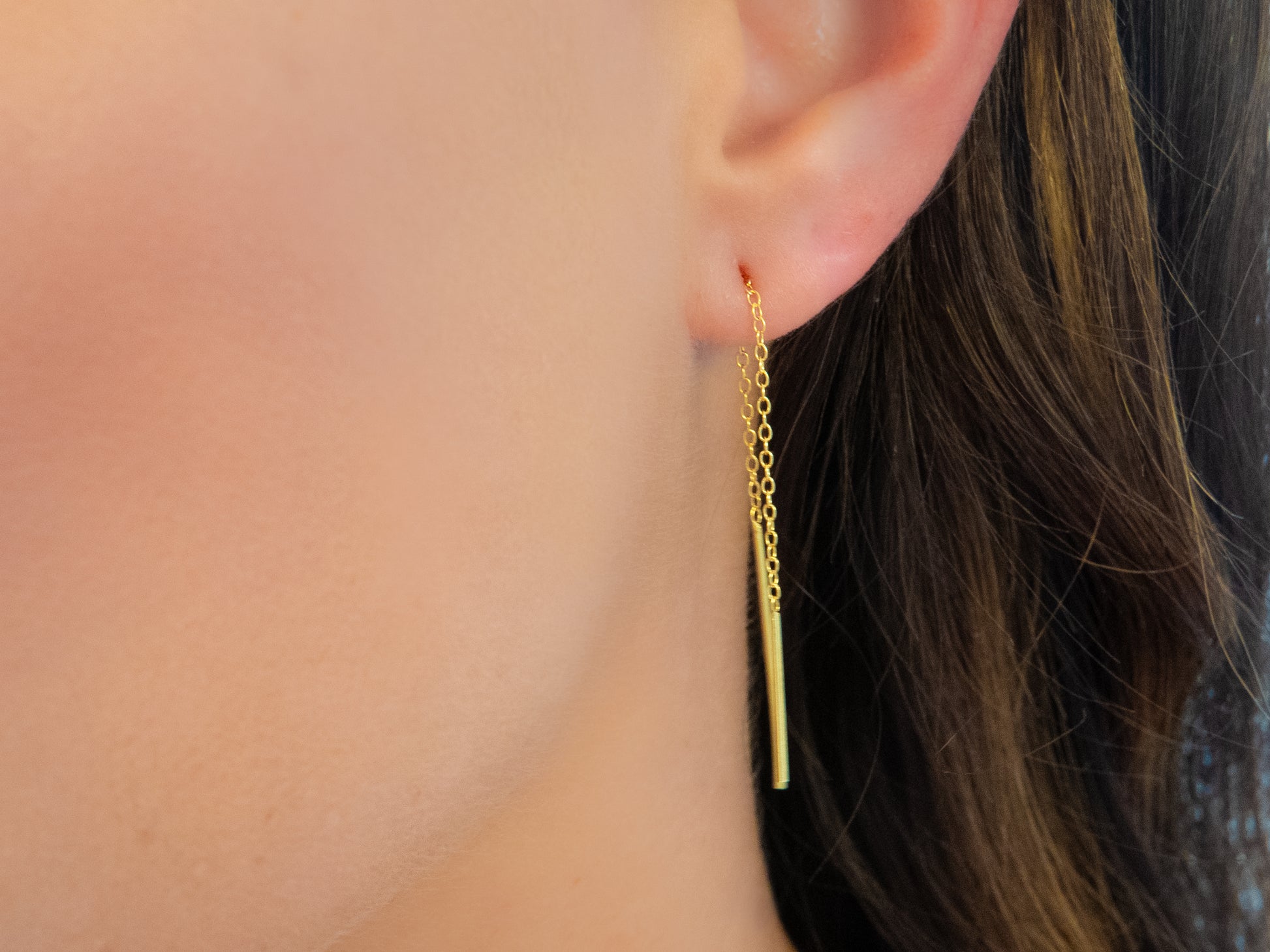 The longer bar is usually worn at the back of the earring to create a background for the shorter front bar.